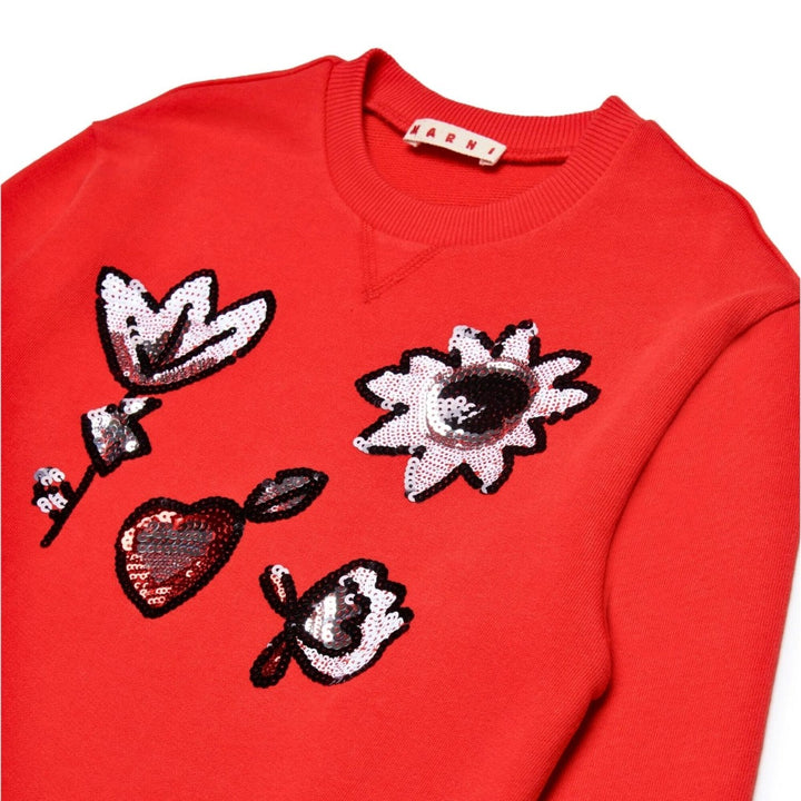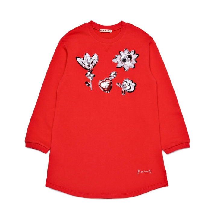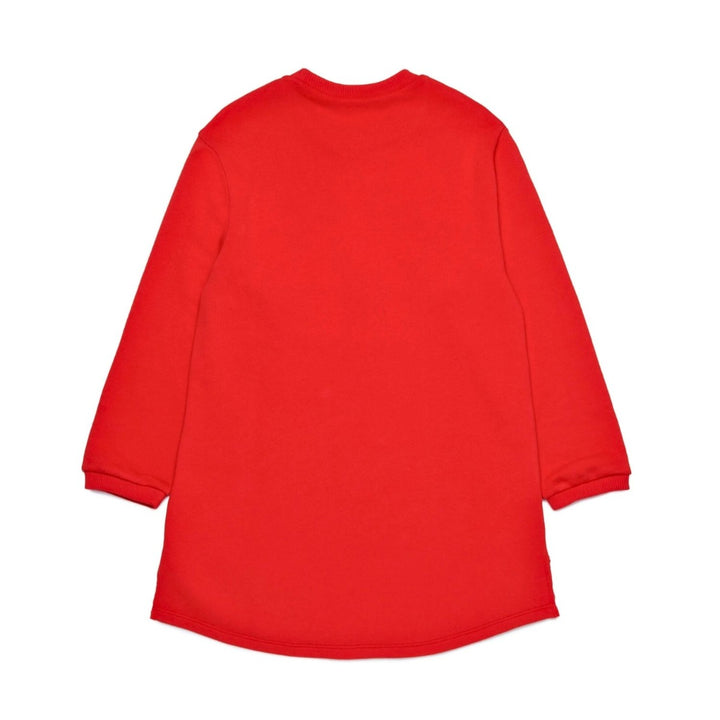 Long-sleeved crew-neck fleece dress. Features sequins on the front. Embroidered cursive logo in contrasting colour. Rounded bottom with splits at the sides. Made of 100% cotton. An original garment, perfect for an extraordinary look.