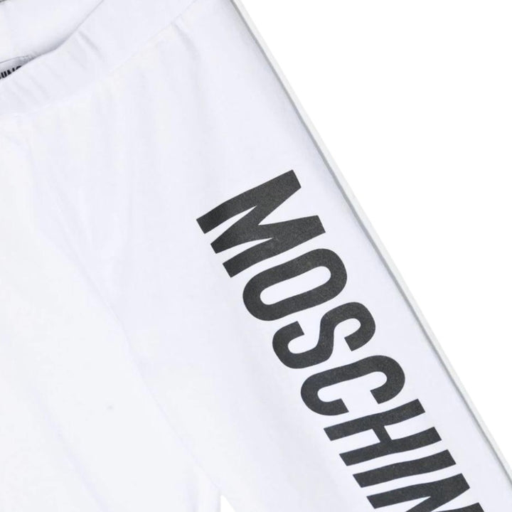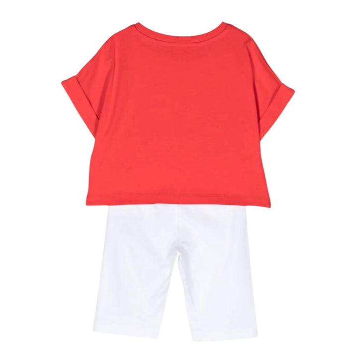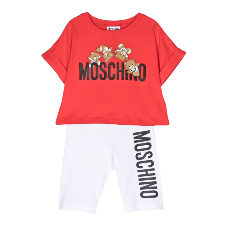 Red top and white shorts set for girls, unmistakably by luxury Italian brand Moschino Kid-Teen. Both pieces are printed with the designer's name in bold letters, with their iconic Moschino Teddy Bear featured on the front of the top. Made in comforta