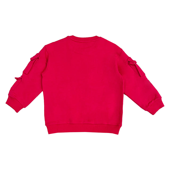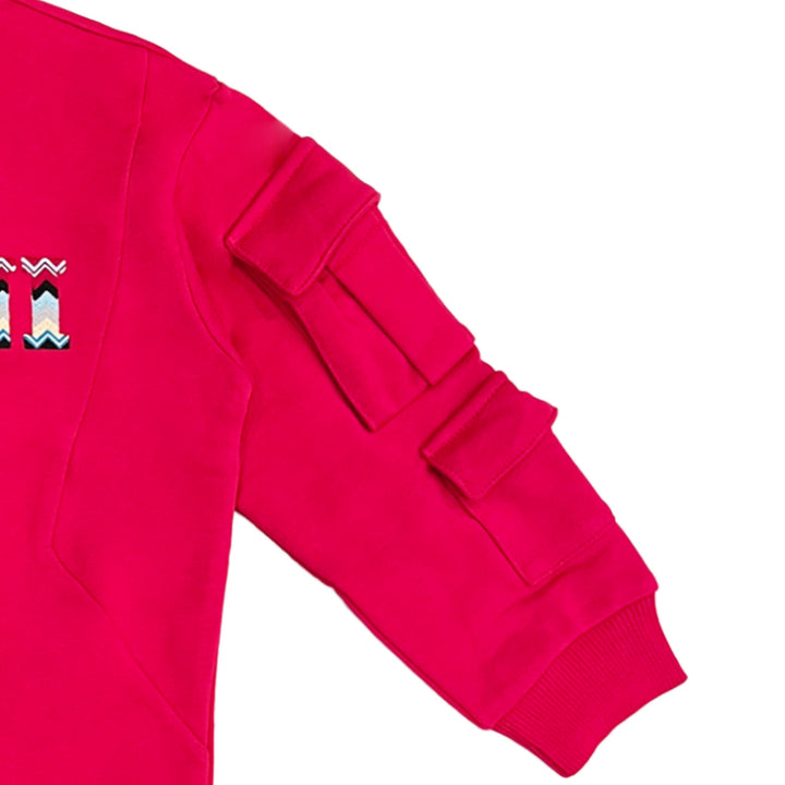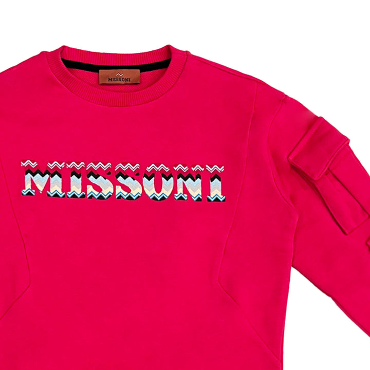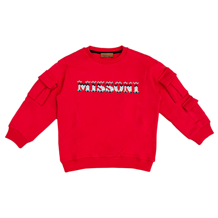 Red sweatshirt for boys by luxury Italian brand Missoni, made in soft, mid-weight cotton jersey. Casual and comfortable, it has an embroidered logo across the front featuring the designer's signature zigzag pattern, in red, blue and yellow. There are