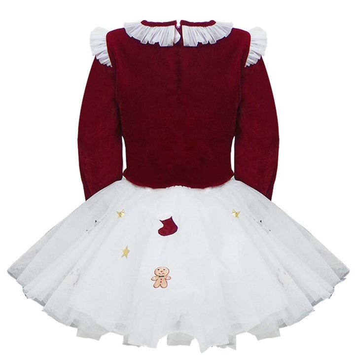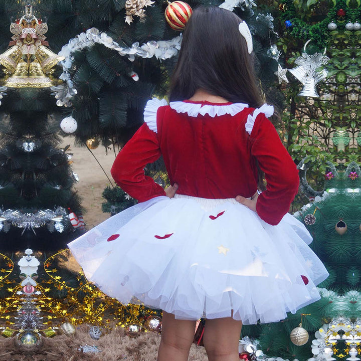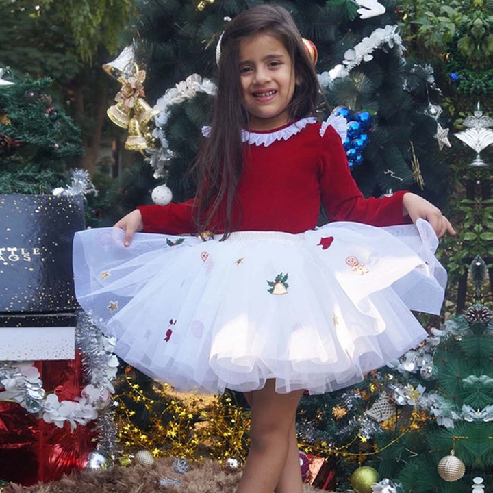 Girls Red & White Xmas Velvet Skirt Set featuring a festive red velvet skirt paired with a white top, designed for comfort and style. Perfect for Christmas parties and holiday celebrations, with a soft, lined fabric for all-day wear.