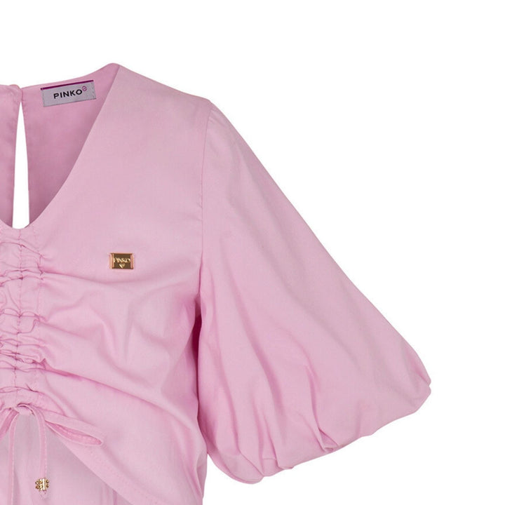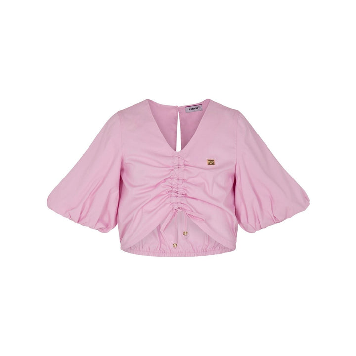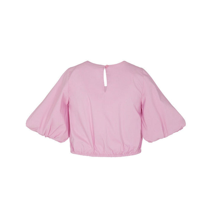 Girls rose pink cotton poplin cropped top with balloon elasticated sleeves. It features a round open chest, drawstring application for adjusting fitting and elasticated hem.
