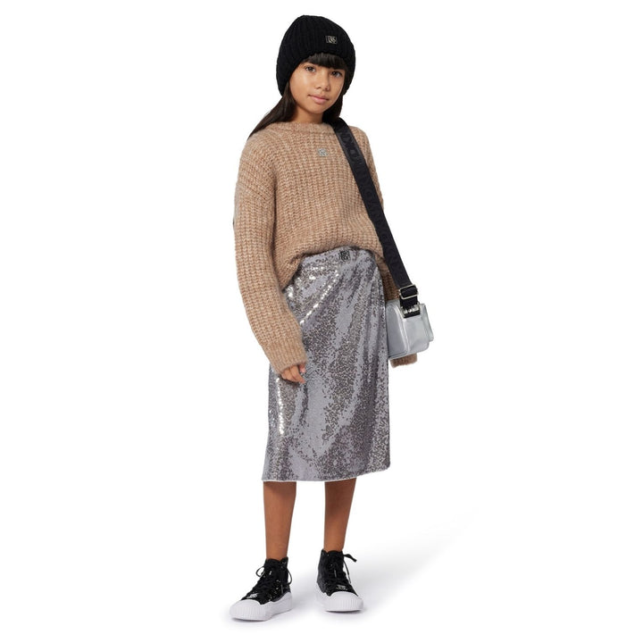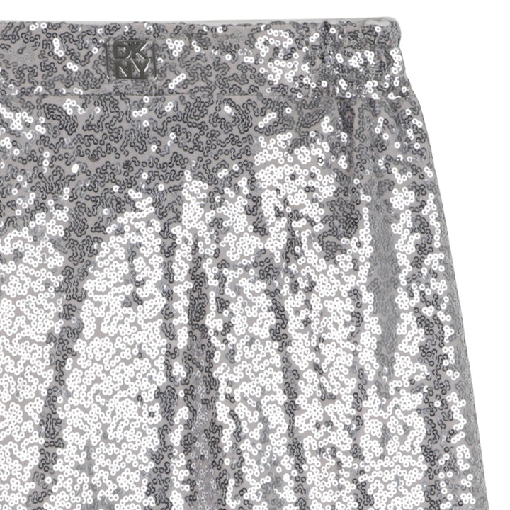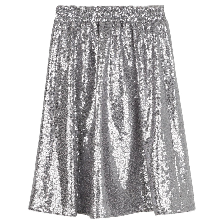 Girls silver sequin-embellished skirt designed with a shimmering finish that adds sparkle to any outfit. Made from a blend of polyester and elastane, it offers a comfortable fit with a stylish look. Perfect for parties, festive occasions, or dressing