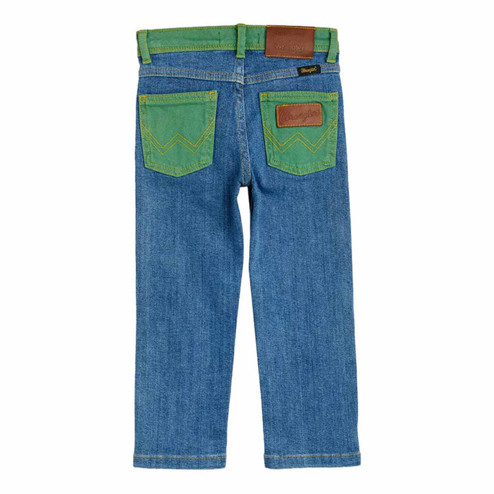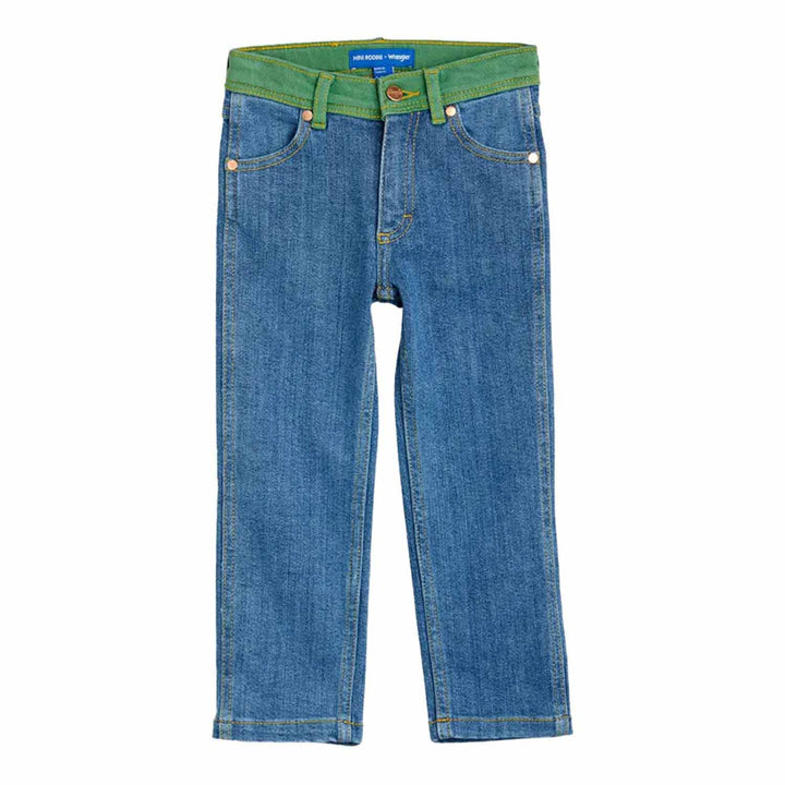Straight fit jeans made from certified organic cotton with a hint of stretch and an adjustable elastic waist for a great fit. The jeans feature two front pockets and two back pockets with a faux leather Wrangler label, as well as a Mini Rodini x Wran