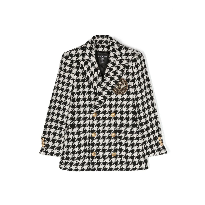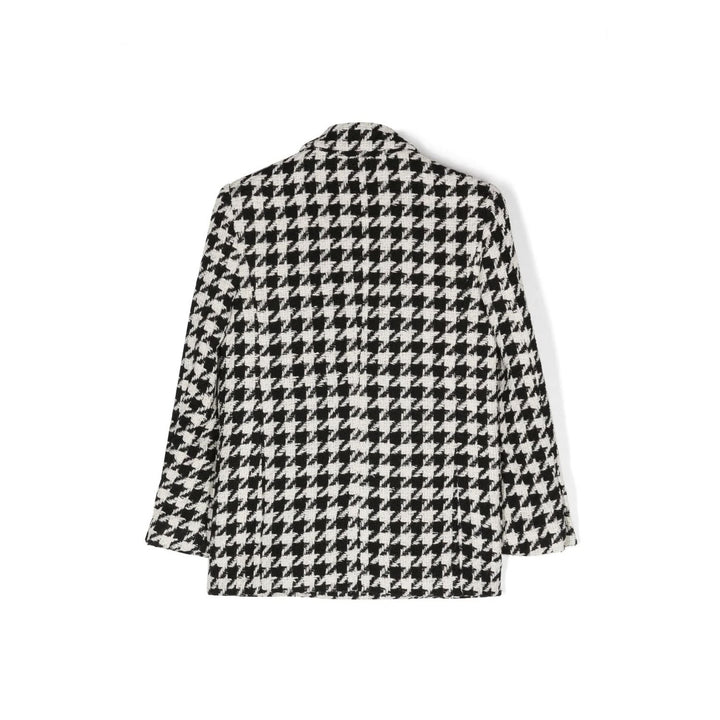 Features - black-white ,houndstooth pattern,knitted construction,notched lapels,double-breasted button fastening,gold-tone buttons,two front patch pockets,logo patch at the chest,long sleeves,buttoned-cuff sleeves,straight hem.