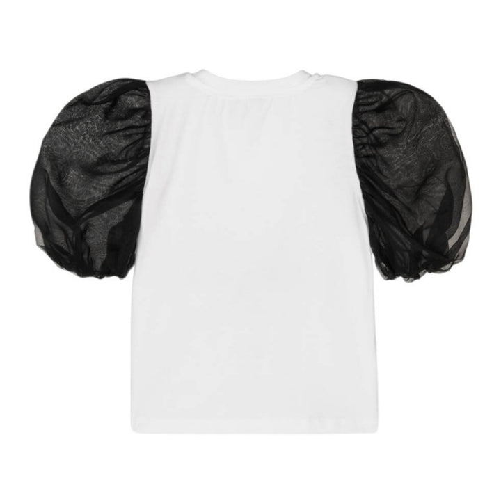 An elegant top for girls by renowned Lebanese designer, Elie Saab. The main body is made in white soft cotton jersey and is accented with black silk organza puff sleeves, creating a monochrome silhouette. The front of the T-shirt is decorated with sp