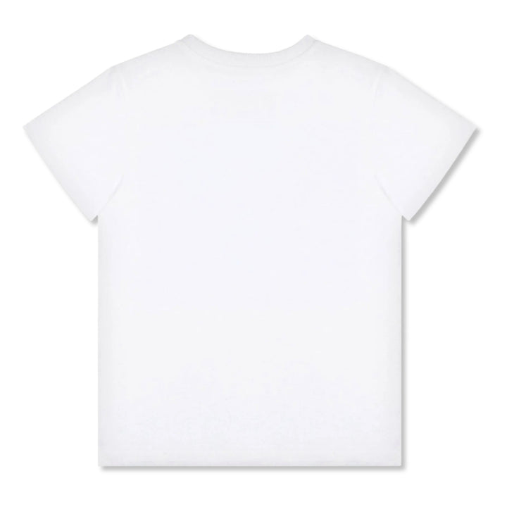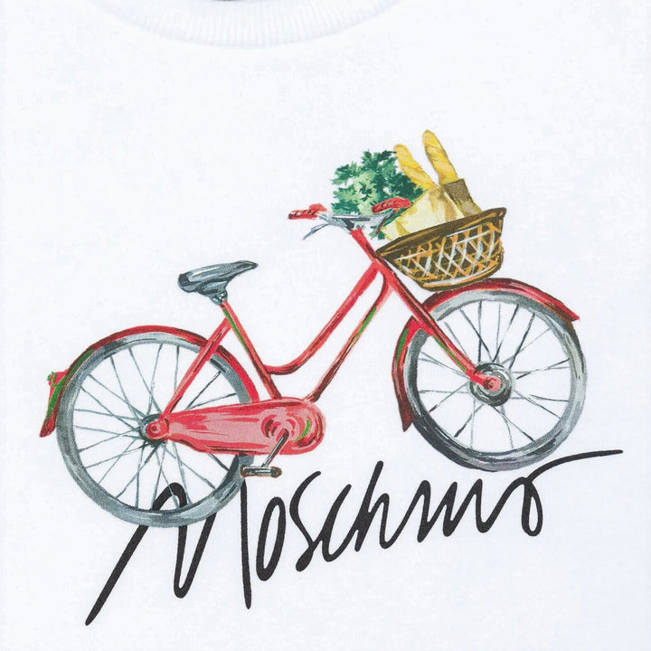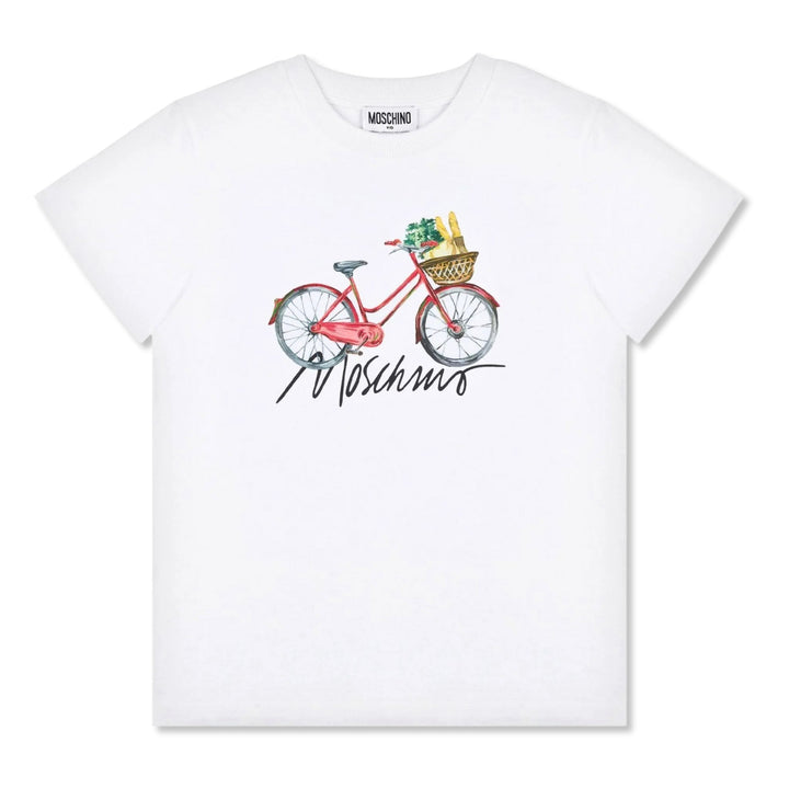White bike-print T-shirt with a front logo print, crew neck, and short sleeves. A fun and casual addition to any wardrobe.