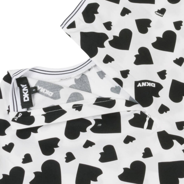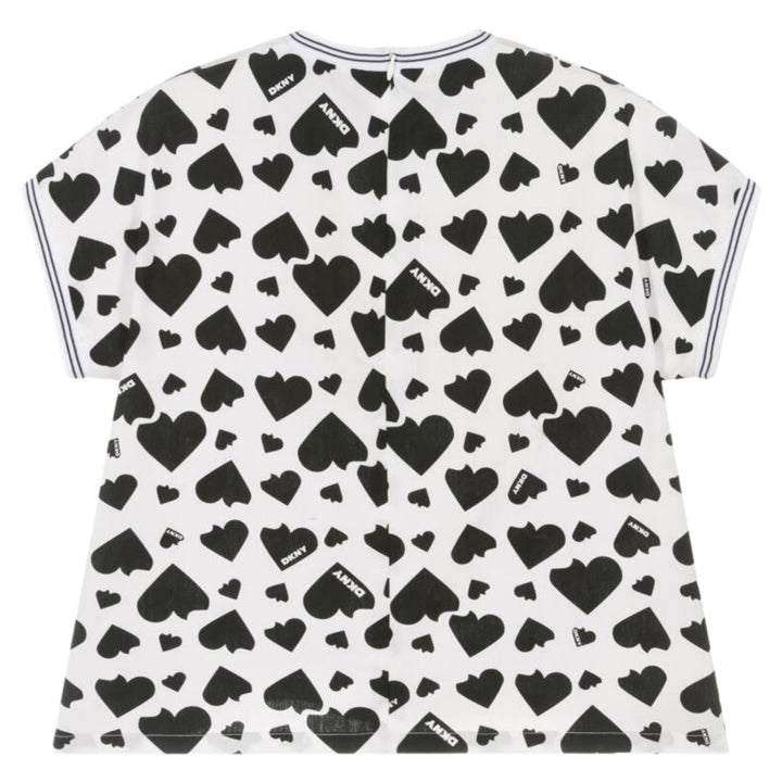 White cotton top for girls by DKNY, patterned with black hearts and logos. Lightweight and comfortable, it has striped, ribbed trims and a concealed zip fastening on the back.