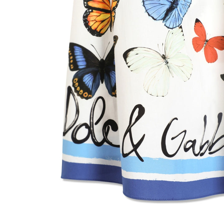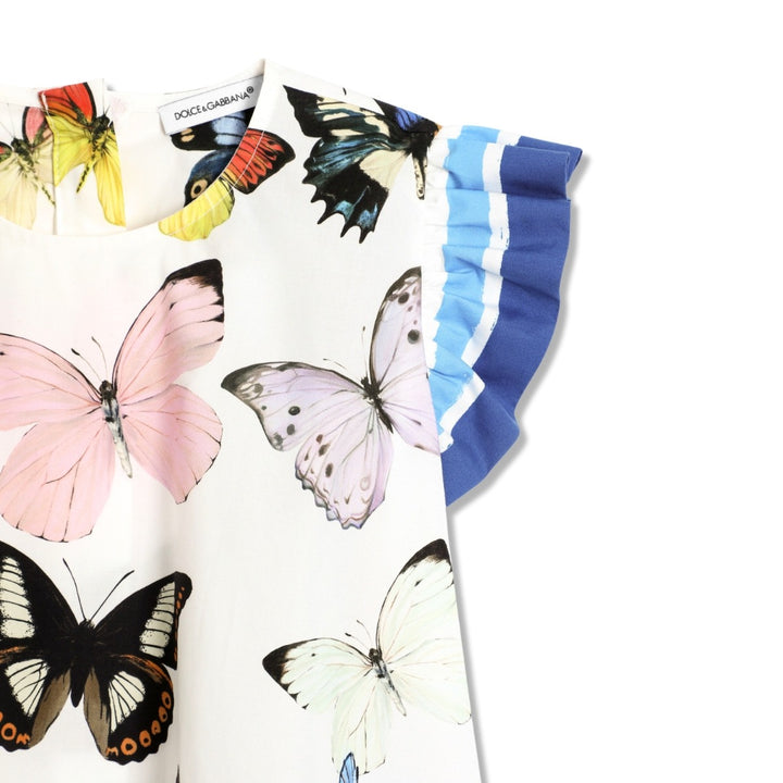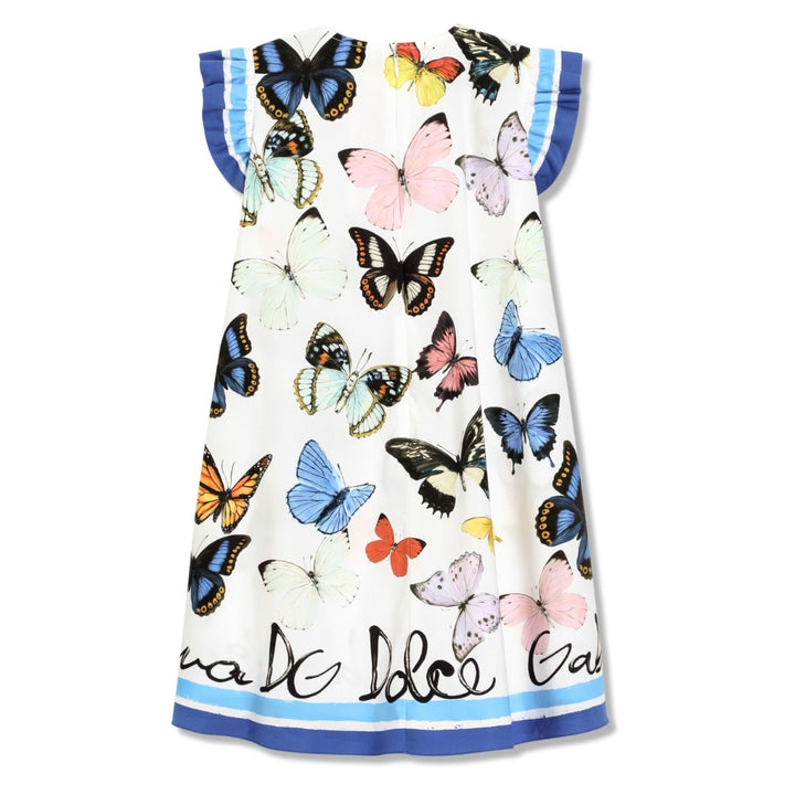 Beautiful white dress for girls by Dolce & Gabbana, patterned with colourful butterflies. Made from lightweight cotton poplin, the dress is accentuated with blue trim and ruffle sleeves, and comes with matching knickers. The gently flared silhouette, with a neat zip fastening on the back, provides comfort and style for warmer days.
