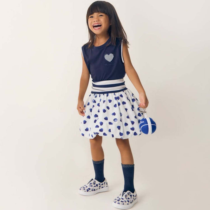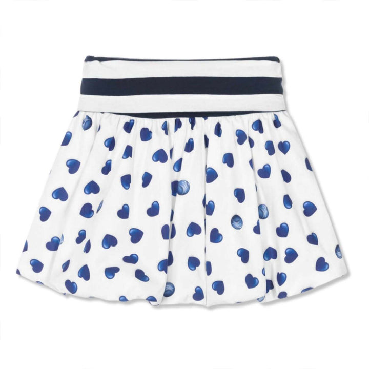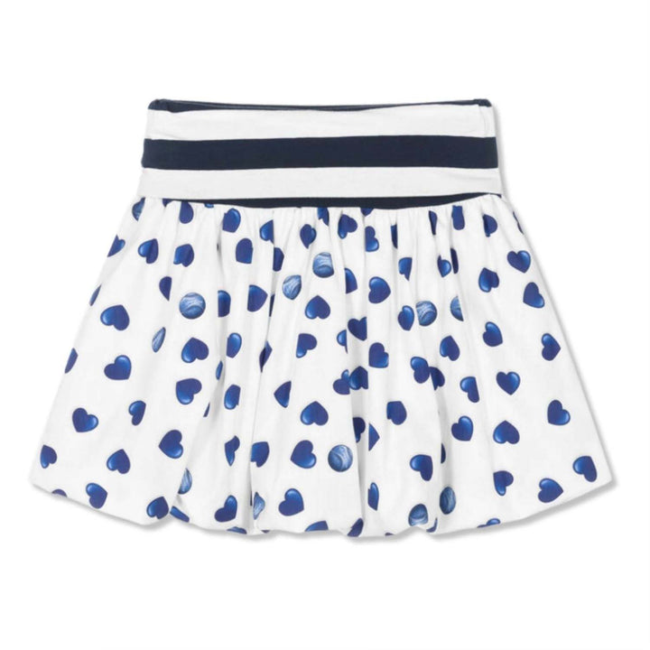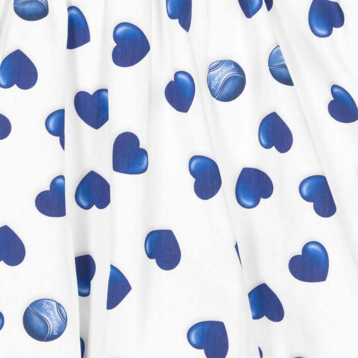 Patterned in blue hearts and tennis balls, with a voluminous bubble hem, this white cotton skirt for girls is by Monnalisa. Made in smooth cotton poplin with a lightweight lining, this fun design has an elasticated waistband in blue and white striped