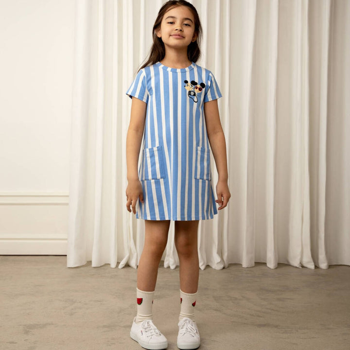 White t-shirt dress with blue stripes and a Ritz Ratz print on the chest, made from GOTS certified organic cotton with stretch. The dress is designed with two front pockets and a binding at the neckline.