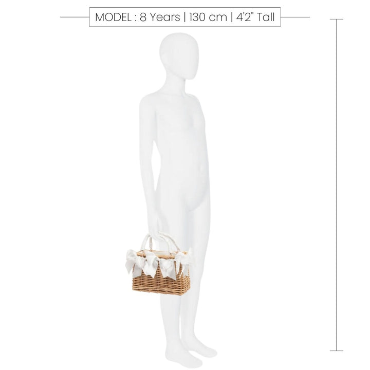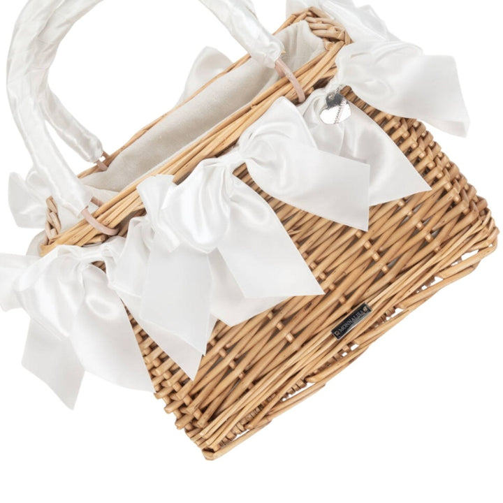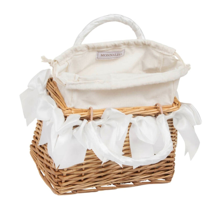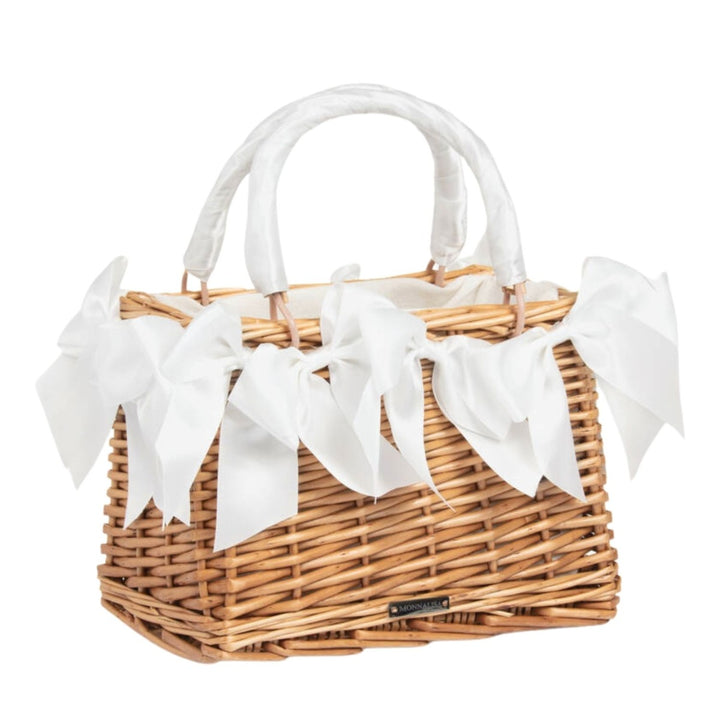 A modern straw handbag for girls by Monnalisa, adorned with white satin bows around the top. Fully lined with fabric that can be secured closed via a drawstring, this structured bag has fixed carry handles. For a designer finish, there are two small silver logo charms on the front.