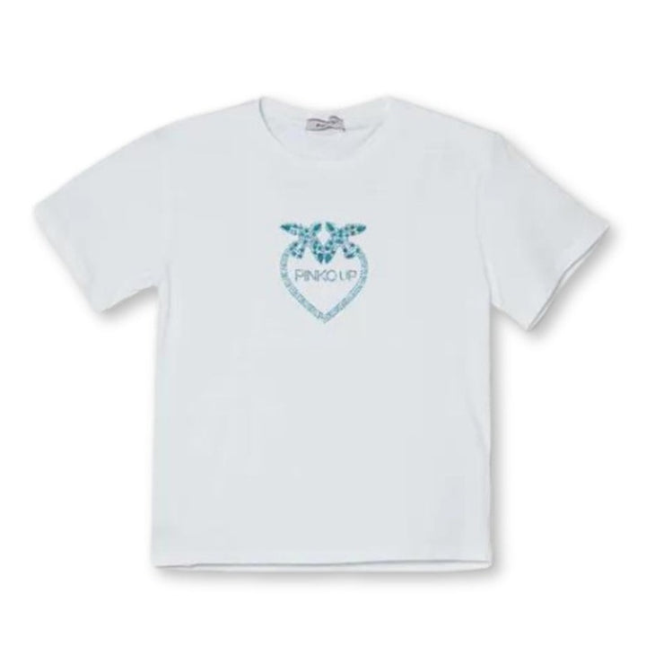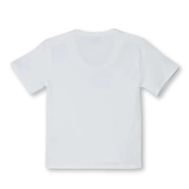 Girls bubble white cotton t-shirt with logo made of rhinestones and studds.