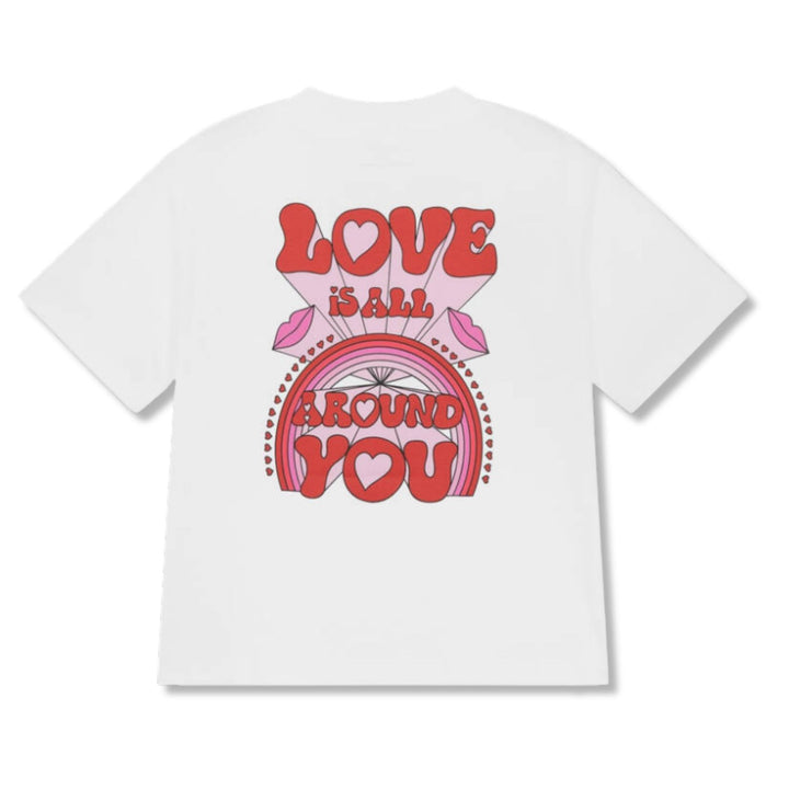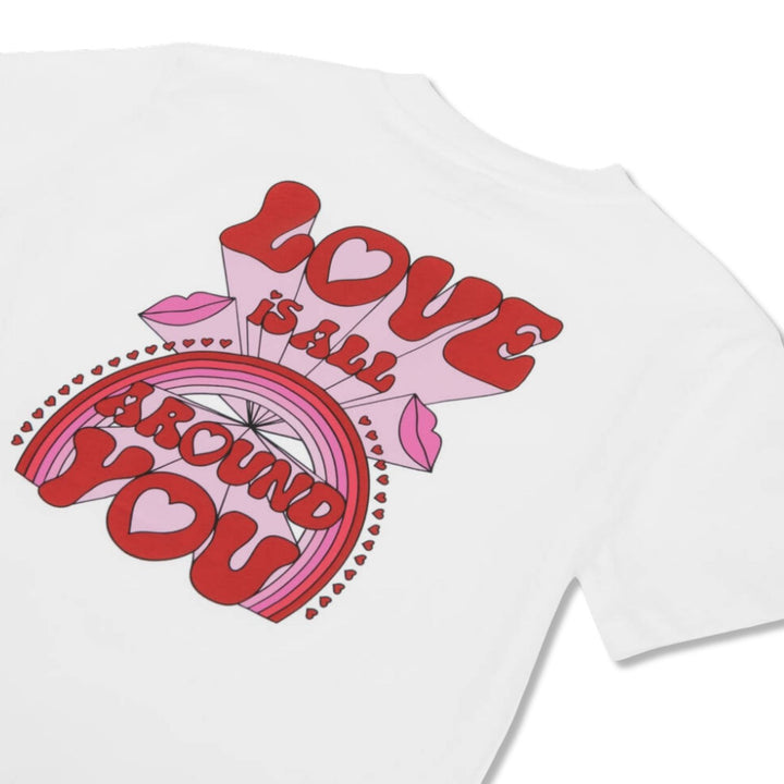 White cotton T-shirt for girls by Stella McCartney Kids, made in soft comfortable jersey. With a casual, laid-back, 7s vibe, it has a red Stella Love logo on the front and a matching, bold red and pink love is all around you graphic on the back.