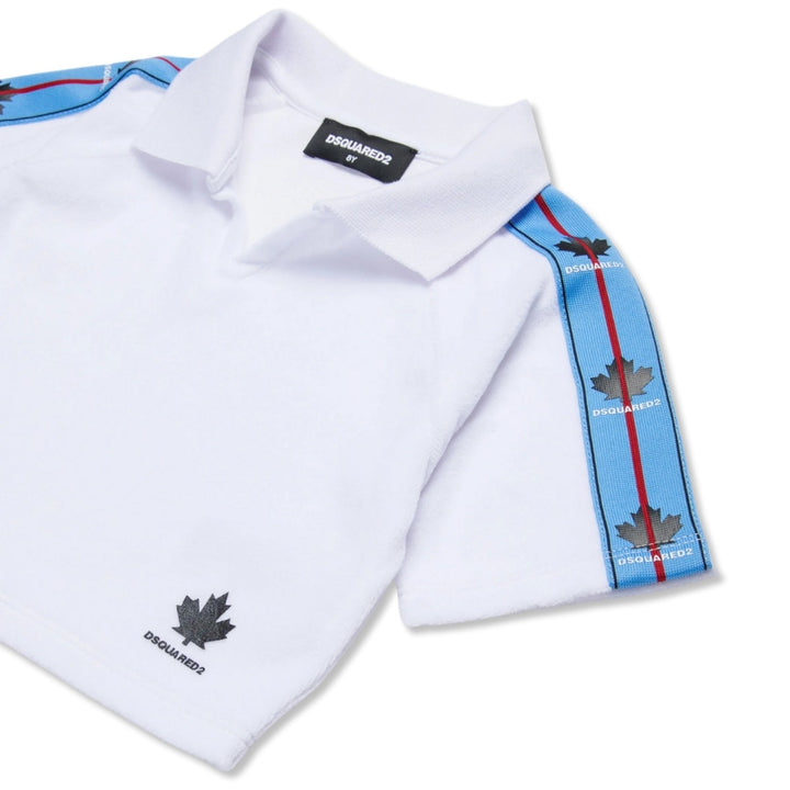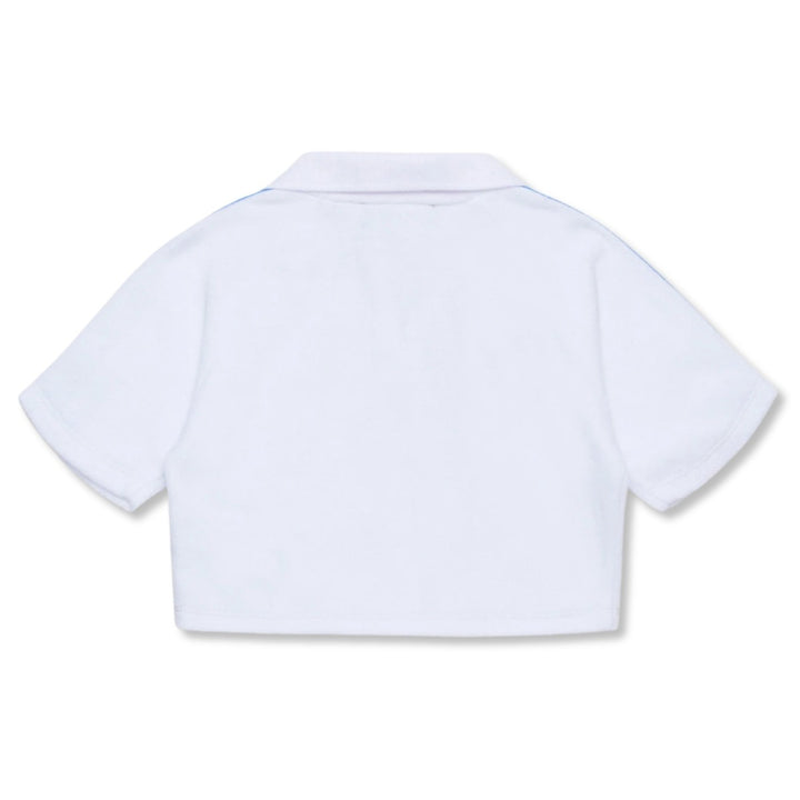 Cropped short-sleeved T-shirt in chenille. Polo collar. Features a logo ribbon insert on the shoulders. Maple Leaf on the front in contrasting colour.