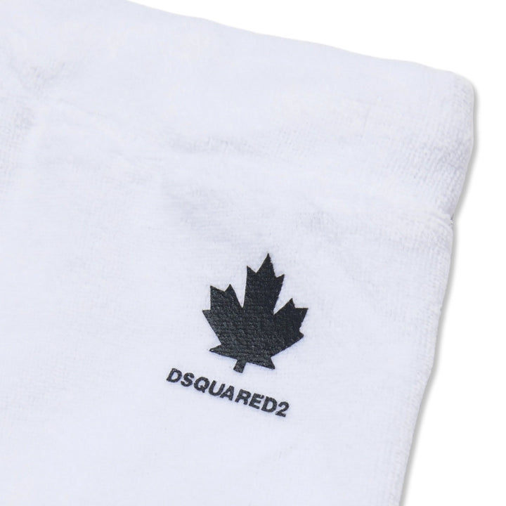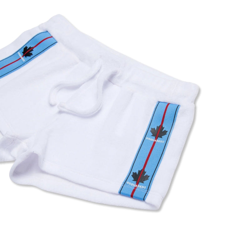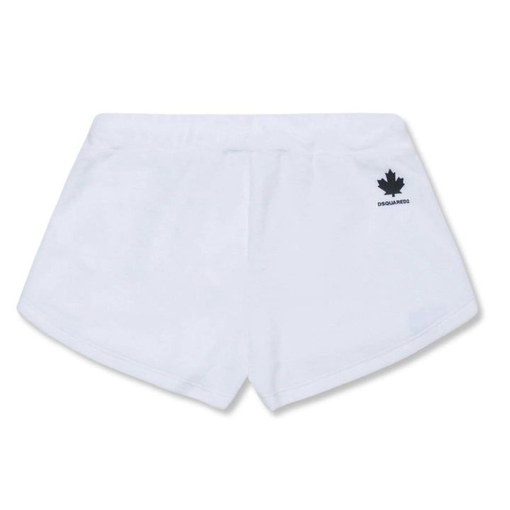 The DSQUARED2 KIDS logo-print shorts in white offer a sporty, stylish look with side stripe detailing and an elasticated drawstring waistband for a comfortable fit. Made from a cotton-polyester blend (75% cotton, 25% polyester), these shorts combine both durability and comfort, making them perfect for casual wear.