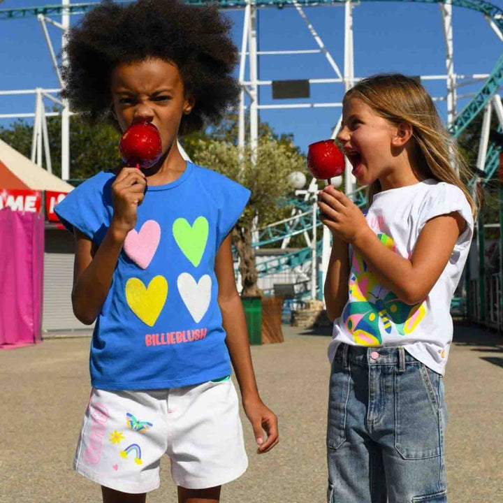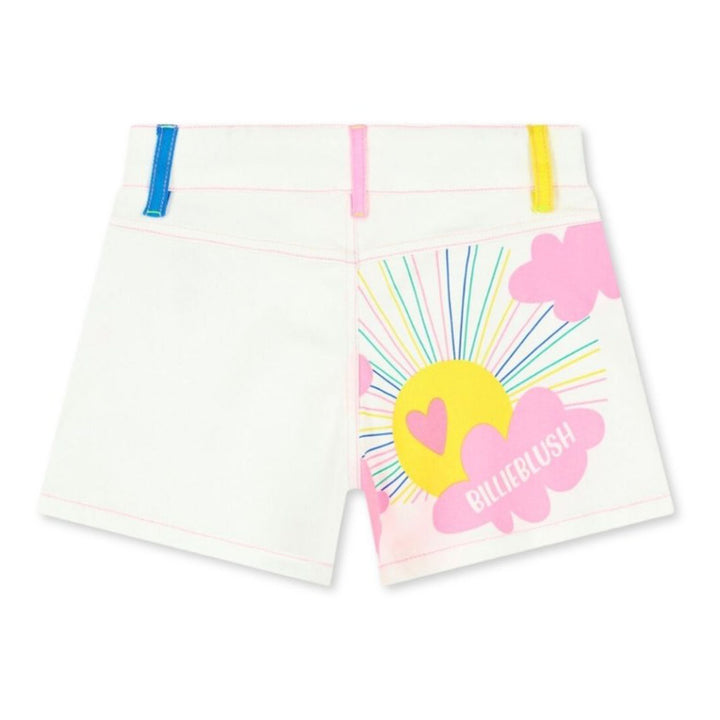 White shorts for girls by Billieblush. Made from soft cotton, they have multicoloured belt loops and graphic design on the front and back with a logo print. Neon pink stitching and pink button to fasten at the front with two front pockets.