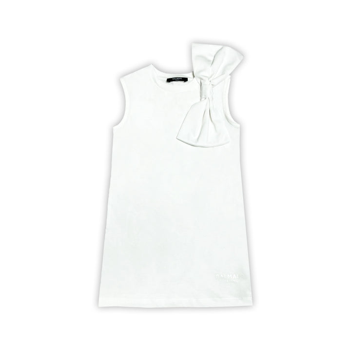 Stylish white dress for girls by luxury French designer, Balmain. Made in soft cotton jersey, this chic, sleeveless design has a statement bow on one shoulder. On the hem, there is a black Balmain Paris logo printed for monochromatic, branded appeal.