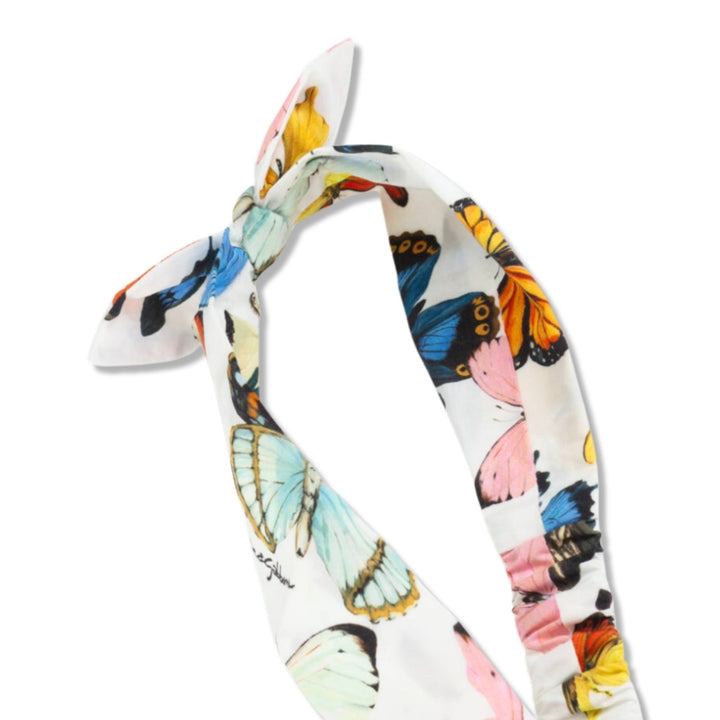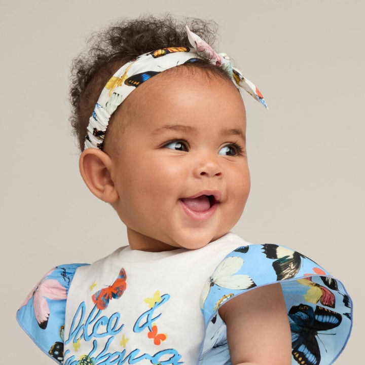 A white headband for little girls by luxury designer Dolce & Gabbana. Made in light cotton poplin, this headband features a delightful butterfly print in lovely blue, pink and yellow hues. The design, both practical and stylish, has a gently elasticated panel on the back for a comfortable fit.