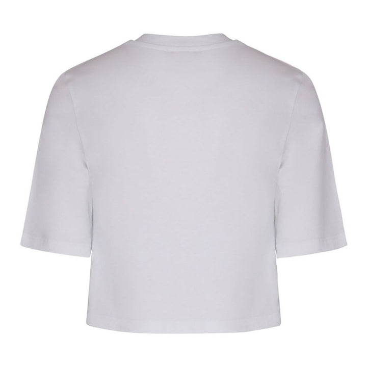 Cool cropped white cotton T-shirt for girls, unmistakably by Italian brand MSGM, with the designers bold brushed logo printed around the neck in black. It is made in comfortable jersey with a boxy fit.