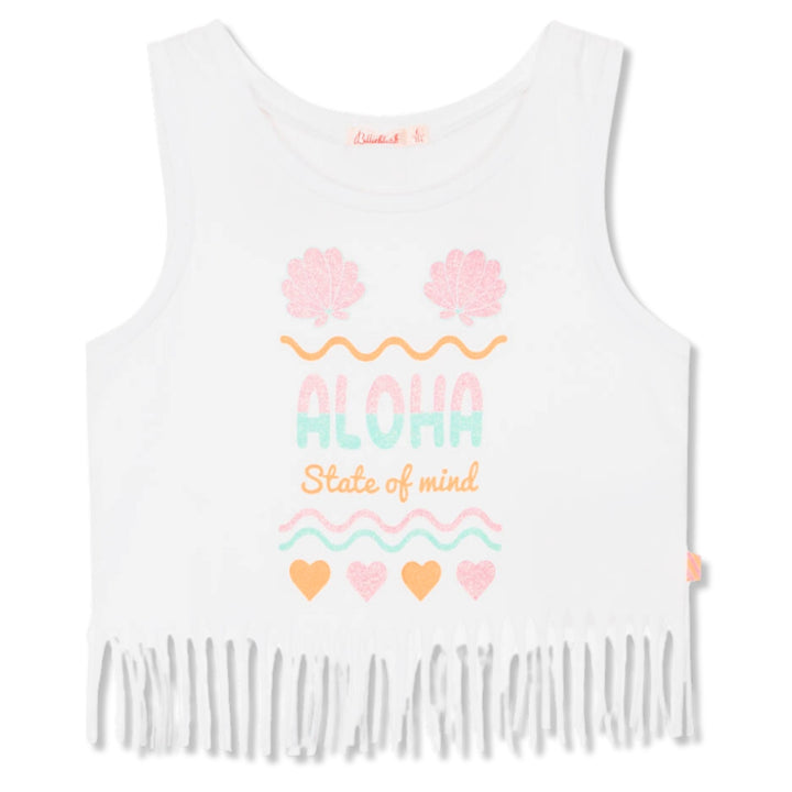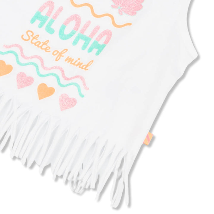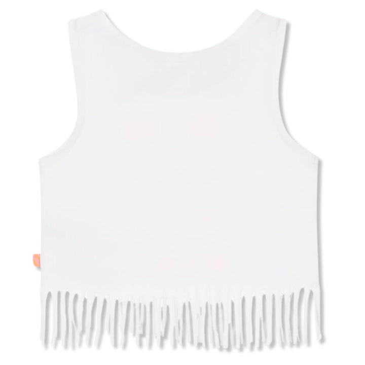White cotton sleeveless T-shirt for girls by Billieblush, with a fringed raw hem for a cool bohemian look. This comfortable warm weather style has a pretty, glittery slogan print on the front.
