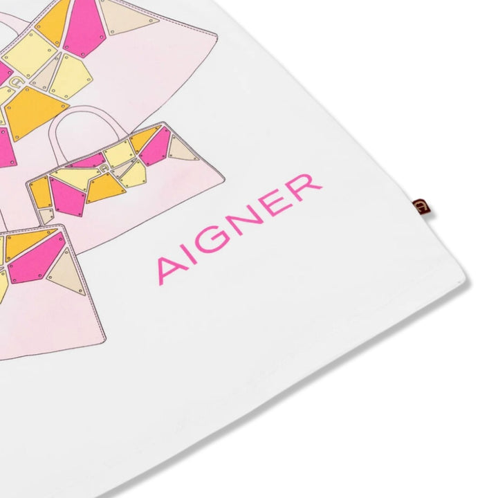 White cotton T-shirt for girls by AIGNER, with a pink, orange and yellow 'Cybill' bag and logo print on the front. Ideal for adding a touch of colour to casual days, it is also comfortable, being made in soft, stretchy jersey.