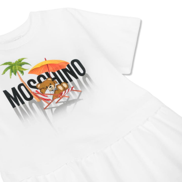 White dress for girls by Moschino, made in soft cotton jersey. This casual piece features a fun motif of the instantly recognisable Moschino Teddy Bear relaxing beneath a palm tree. It is designed in a cool and comfortable T-shirt style, with a ribbed neckline and dropped waist.
