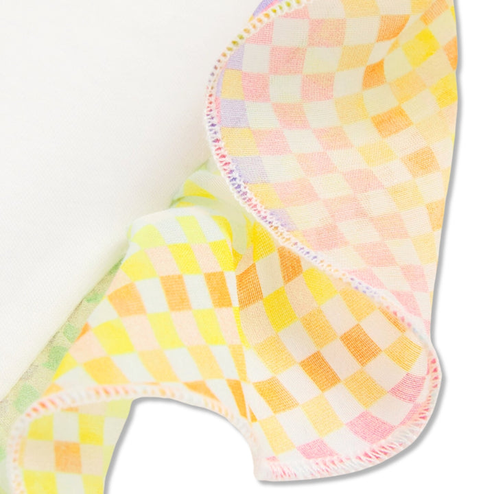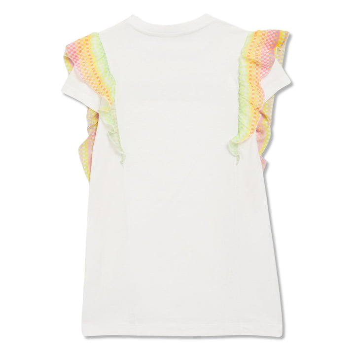 Stylishly comfortable, this white cotton T-shirt dress for girls is from luxury Italian label Missoni. Made in soft jersey, it has a gentle A-line silhouette with small spits on the front hem. Beautiful organza ruffles with a pixelated pattern in rai