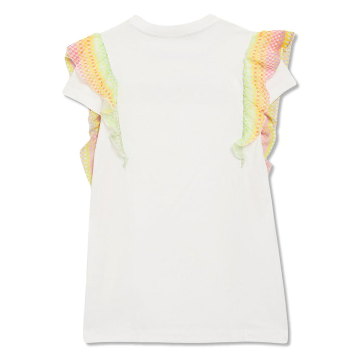 Stylishly comfortable, this white cotton T-shirt dress for girls is from luxury Italian label Missoni. Made in soft jersey, it has a gentle A-line silhouette with small spits on the front hem. Beautiful organza ruffles with a pixelated pattern in rainbow shades and a shimmering, rhinestone logo on the front add a signature designer finish.