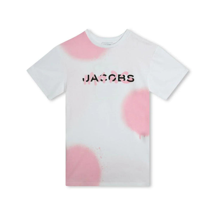 Girls white & pink organic cotton T-shirt by MARC JACOBS, printed with bold, pink, spray paint dots. This casual short-sleeved top has a classic crew neck and a statement black and blue spray paint logo print across the front.