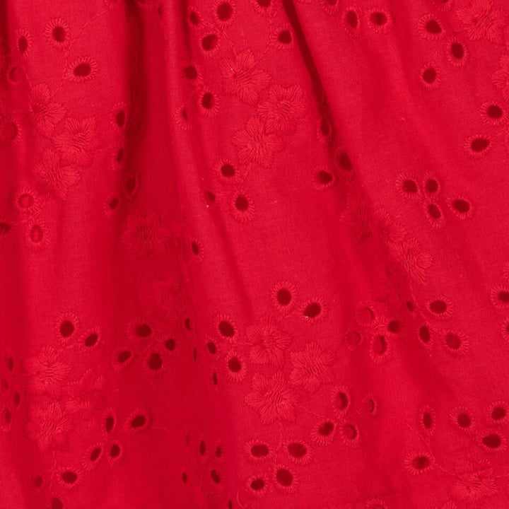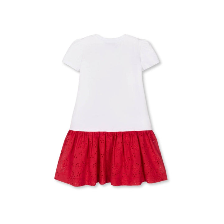 A lovely white and red dress for girls by Monnalisa, made from the softest cotton. The jersey bodice has a strawberry printed on the front with gold diamanté detailing for a playful, sparkly look. It has puffed short sleeves and a beautiful red brod
