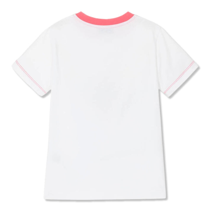 From luxury Italian label Missoni, a white T-shirt for girls, made in soft organic cotton jersey. This relaxed style has contrast pink ribbing on the neckline and matching stitching on the short sleeves. For a distinctive finish, there is a logo print across the front in the brand's signature zigzag pattern.