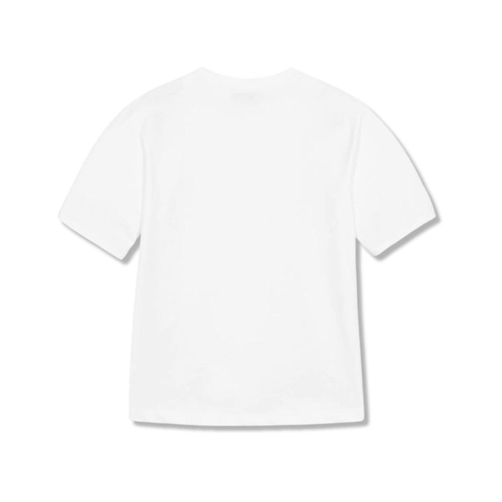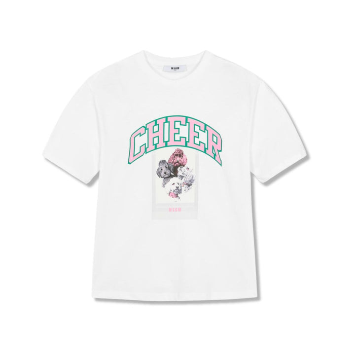 Girls white T-shirt by Italian brand MSGM, made in soft, comfortable cotton jersey. This short-sleeved top has a pink and green 'Cheer' print on the front for a college-inspired feel, with a cute dog print and the designer's pink micro logo below.