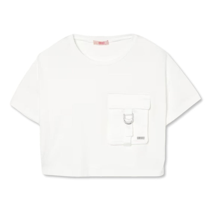Add a touch of edgy style to her casual looks with this white cropped T-shirt, featuring a utility style pocket accented by a bold metal D-ring and flap closure. The boxy silhouette and soft cotton fabric make it both trendy and comfortable ideal for pairing with high waisted jeans, joggers, or skirts for a cool, urban vibe.