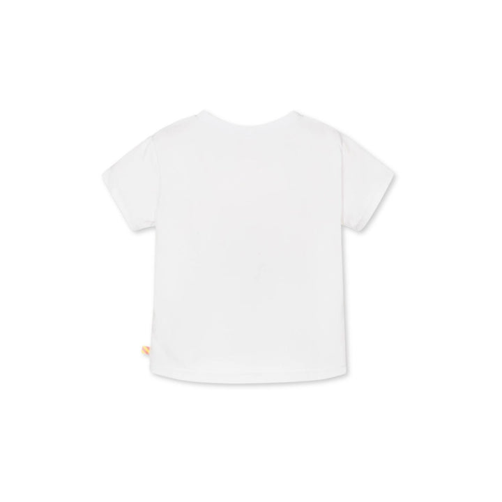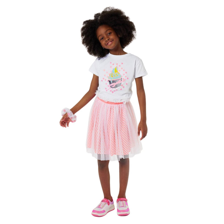 A white short-sleeved T-shirt for girls by Billieblush, made from soft organic cotton jersey. Part of the Happy Birthday collection, it has a cupcake design with glittery pink polka dots and neon yellow sequined sprinkles for a fun look. This tee com