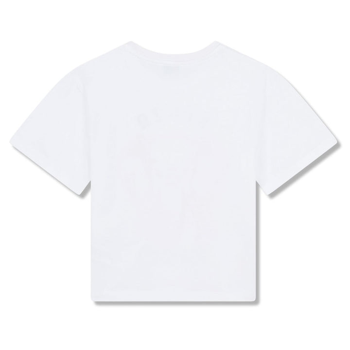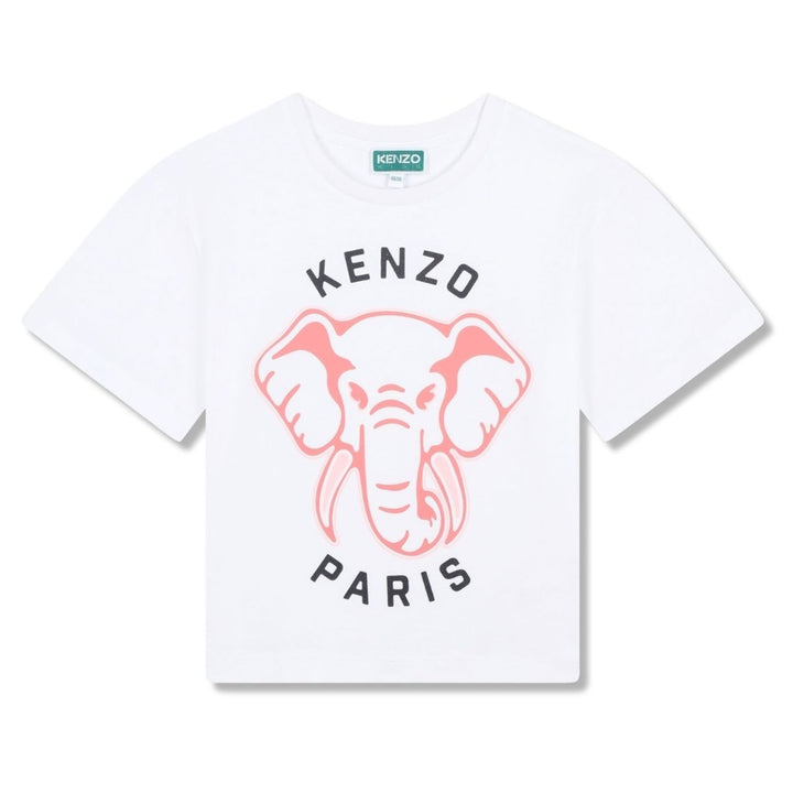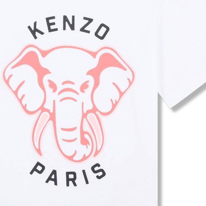 A white T-shirt for girls by KENZO KIDS, made in soft organic cotton jersey with a relaxed fit. This short-sleeved tee is printed with black lettering and the iconic Elephant motif, a signature design from the French brand. It has a gently ribbed nec