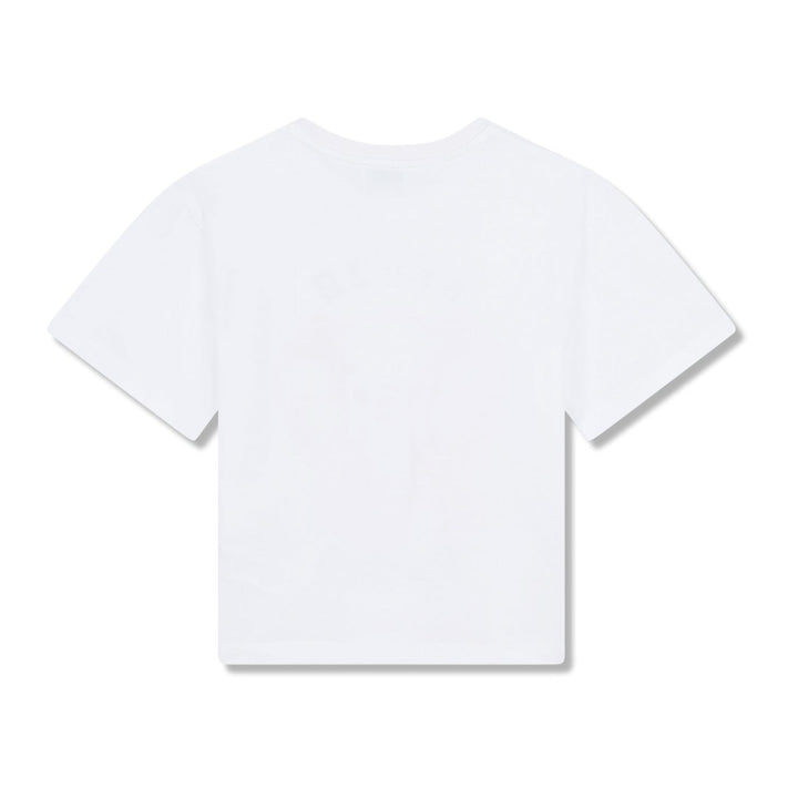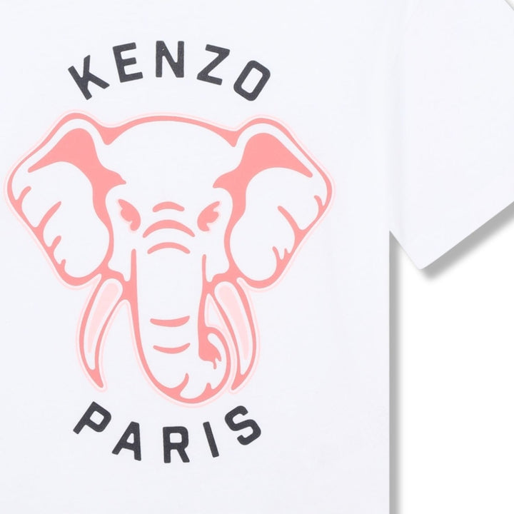 A white T-shirt for girls by KENZO KIDS, made in soft organic cotton jersey with a relaxed fit. This short-sleeved tee is printed with black lettering and the iconic Elephant motif, a signature design from the French brand. It has a gently ribbed neckline for casual styling.