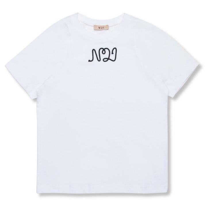 Girls white T-shirt by N21 made from soft cotton with an embroidered logo print simple, stylish and comfortable.