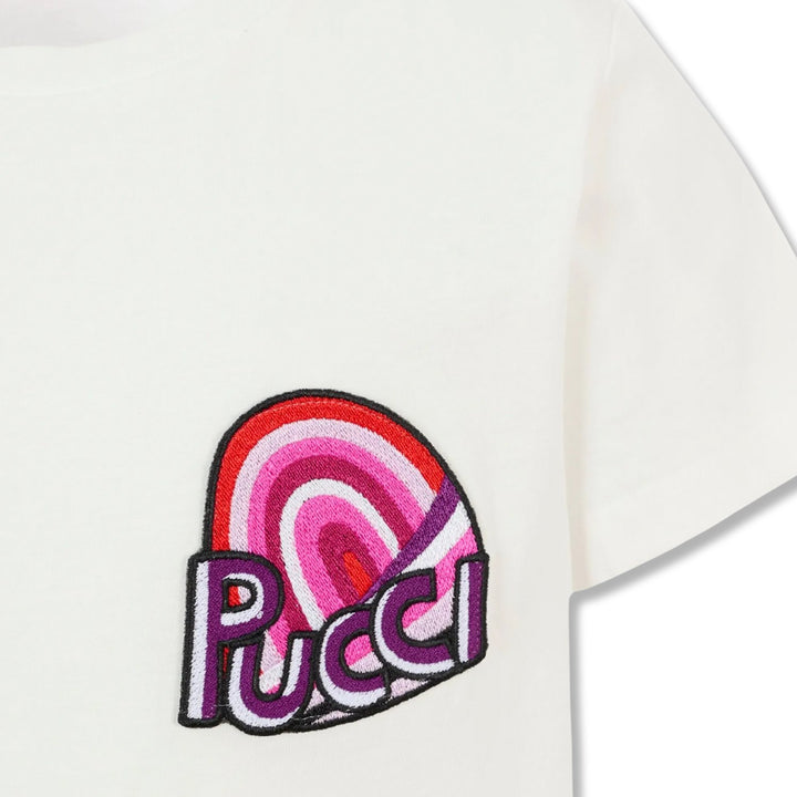 Simple yet sophisticated, this white T-shirt from Pucci is a versatile addition to any young fashionistas wardrobe. Crafted from soft, breathable cotton, it features a classic crew neckline and short sleeves for everyday comfort. The standout detail