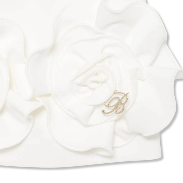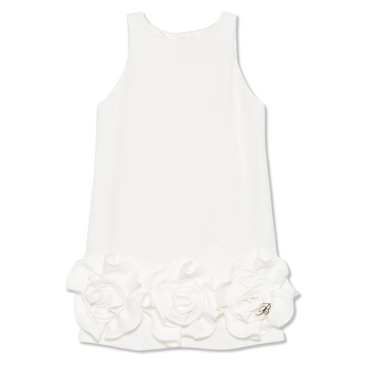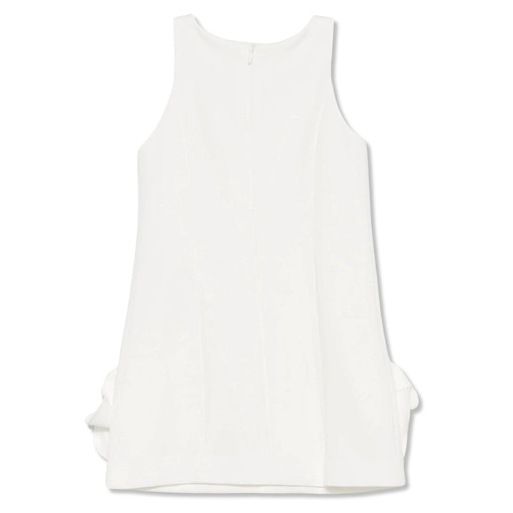 This is a sleeveless white dress with a classic A-line silhouette. It features a round neckline and a clean, minimalist design. The standout detail of the dress is the row of oversized 3D floral appliques adorning the hemline, adding a sophisticated and elegant touch. A small metallic monogram or logo embellishment is also present near the floral detailing. This dress is ideal for formal events, parties, or special occasions, offering a chic and refined look.