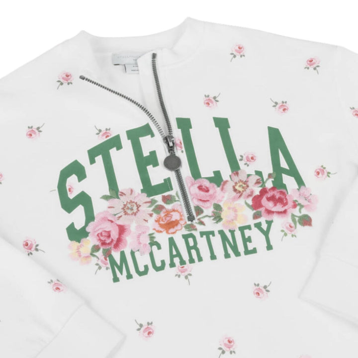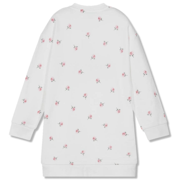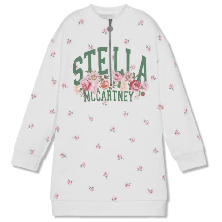 Knee length off-white sweatshirt dress for girls by Stella McCartney Kids, with a pretty prink rose print. Made in soft cotton jersey, it has a fleecy inside for a extra warmth. The designers varsity-style logo is printed on the front in green and th