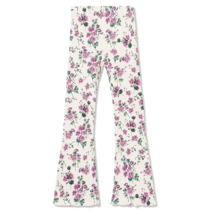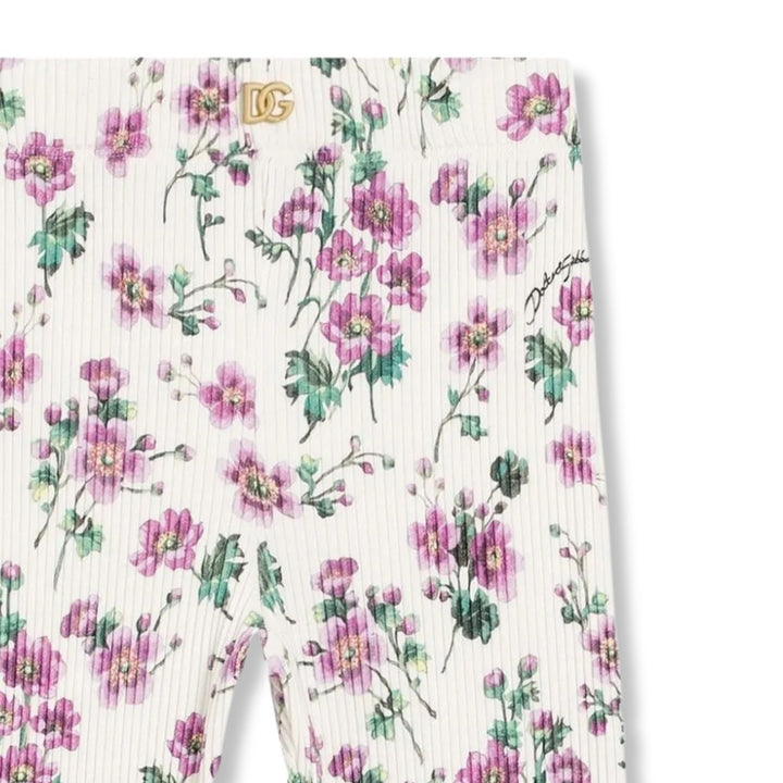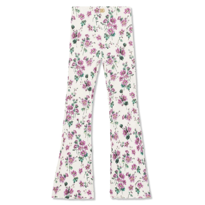 Girls white floral-print trousers by Dolce & Gabbana featuring the brand signature vibrant floral motif, these soft cotton trousers offer a comfortable fit with an elasticated waistband and a chic designer flair perfect for any occasion.