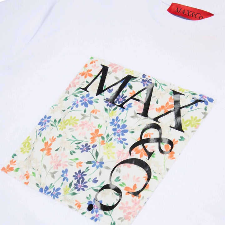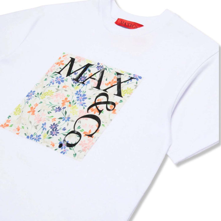 1% cotton jersey T-shirt with crew-neck and short sleeves. Regular fit. Poplin patch with solid floral square and logo on the front. A MAX&Co.