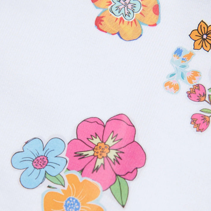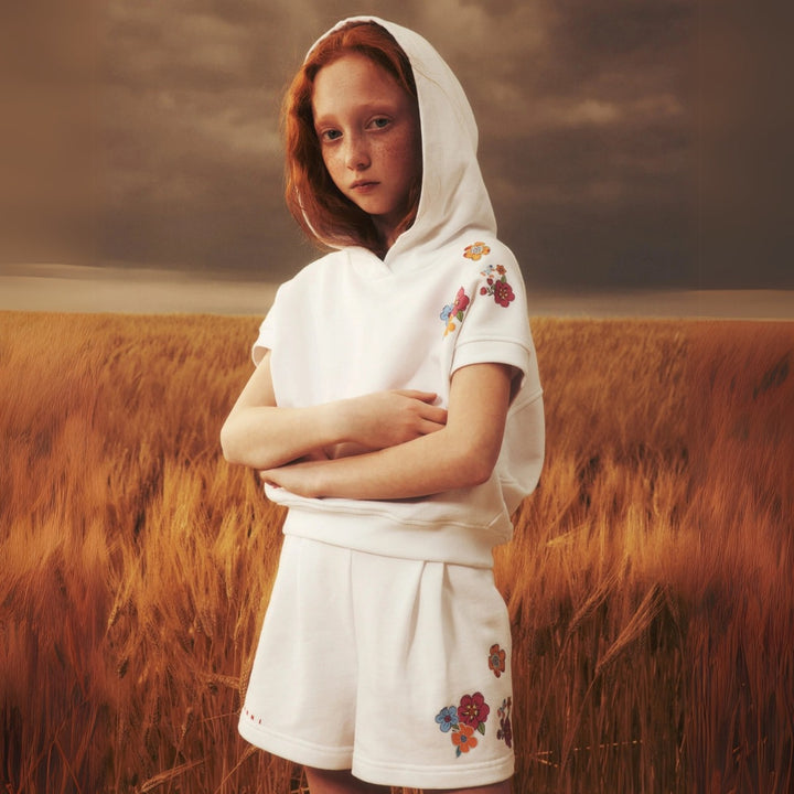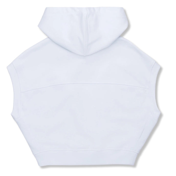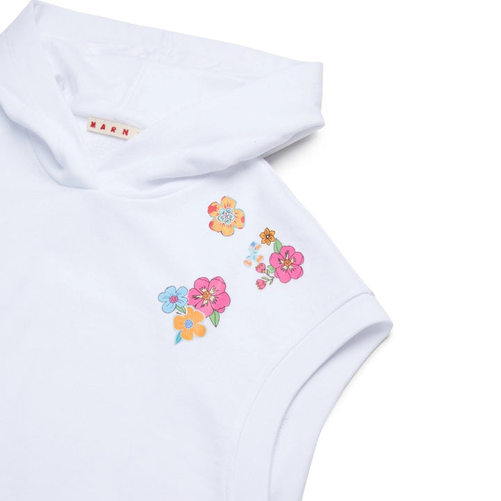 Egg shape sleeveless hooded sweatshirt. Institutional logo and small flowers in contrasting color on the front. Made of cotton.