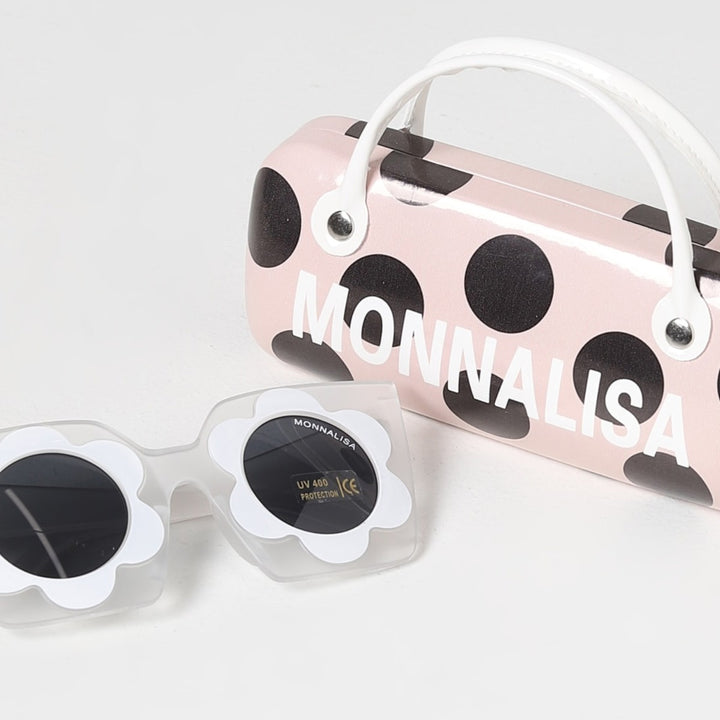 Quirky sunglasses for girls from Monnalisa, with UV protective lenses. These fashion-forward translucent plastic sunglasses have white flowers printed around the black tinted lenses. They come in a protective case printed with polka dots and with car