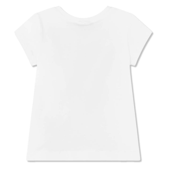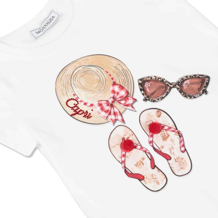 White T-shirt for girls by Monnalisa, made in soft and stretchy cotton jersey. This fun design has beach-themed graphics on the front, including a pair of leopard print sunglasses and a straw sun hat. Red diamantes and pom-poms add extra glam touches