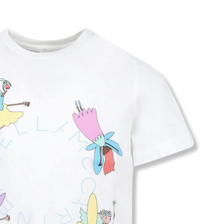 White T-shirt organic cotton, with short sleeves and a ribbed crew neck. It is decorated with fairies and a circular logo printed on the front.