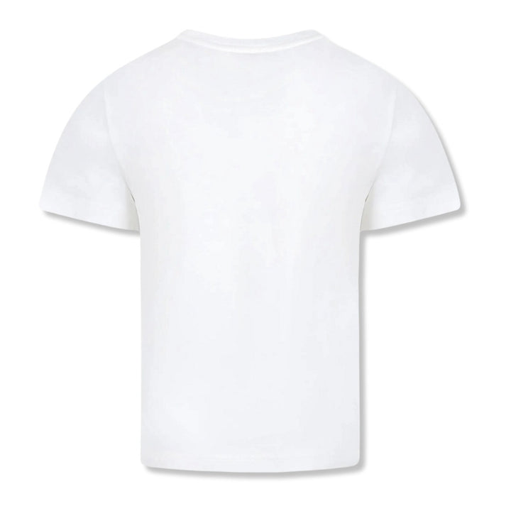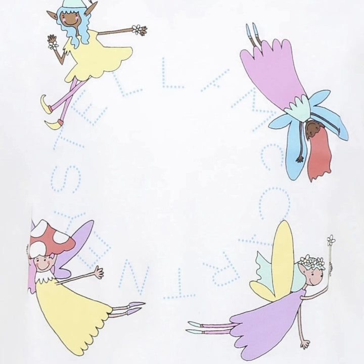 White T-shirt organic cotton, with short sleeves and a ribbed crew neck. It is decorated with fairies and a circular logo printed on the front.