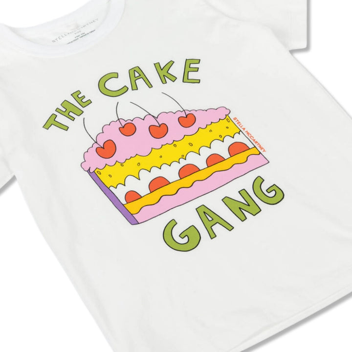 An off-white T-shirt for girls by Stella McCartney Kids, with a colourful cake graphic and The Cake Gang printed on the front. Great for adding a touch of fun to casual outfits, this comfortable tee is made in soft organic cotton jersey.