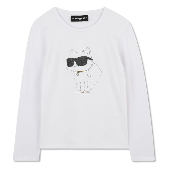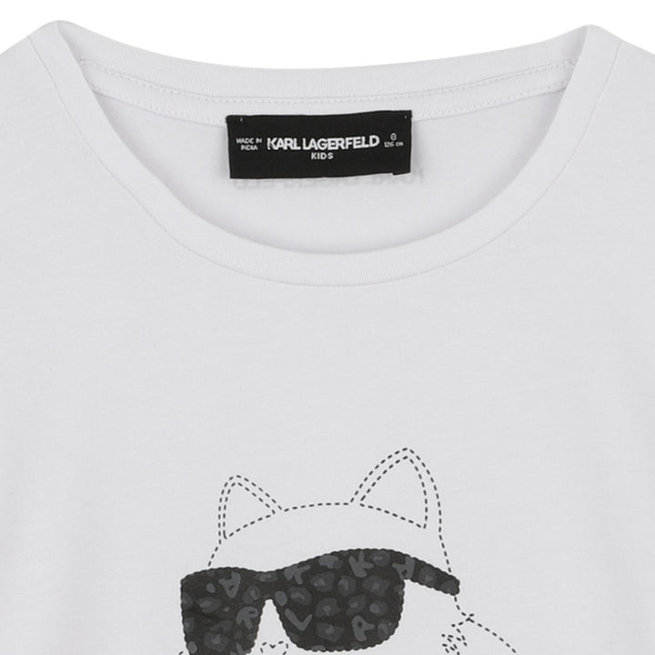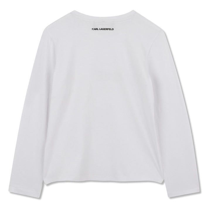 Trendy white graphic-print T-shirt for girls by Karl Lagerfeld, crafted from soft cotton for a stylish and comfortable look.