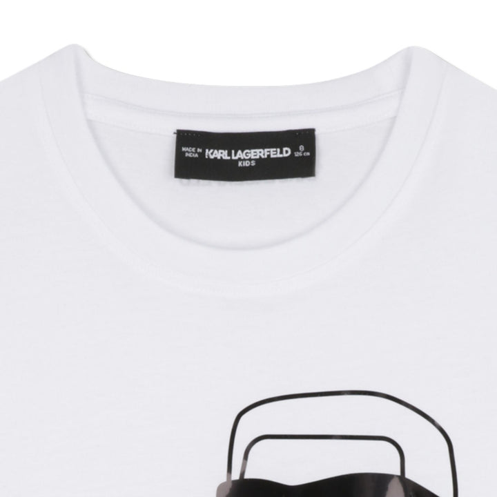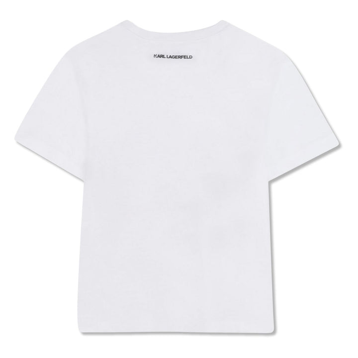 Stylish white graphic-print T-shirt for girls by Karl Lagerfeld, made from soft cotton for a trendy and comfortable fit.